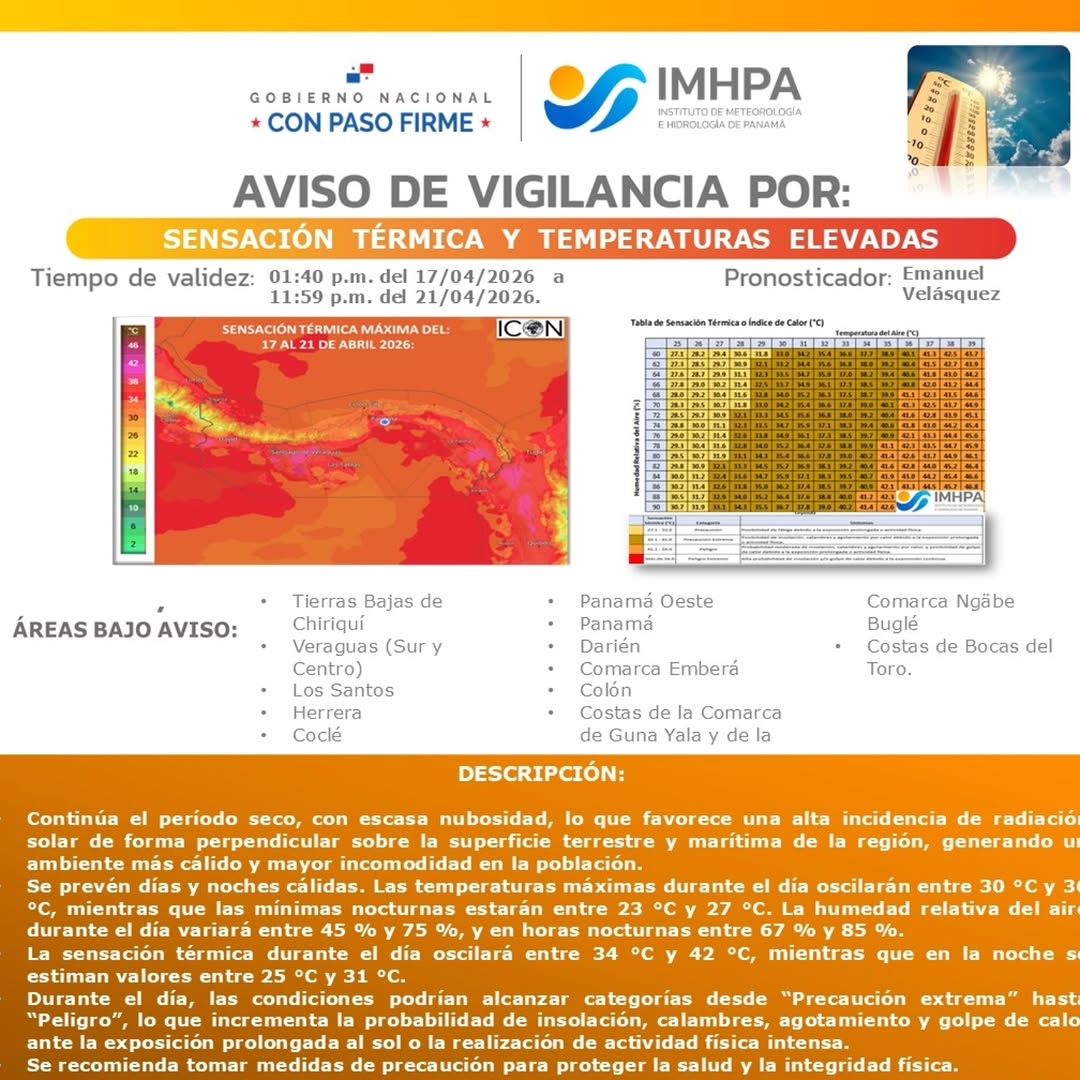 El Instituto de Meteorología e Hidrología de Panamá (IMHPA) emitió un aviso de vigilancia por sensación térmica y temperaturas elevadas en varias regiones del país, vigente desde la 1:40 p.m. del 17 de abril hasta las 11:59 p.m. del 21 de abril de 2026.