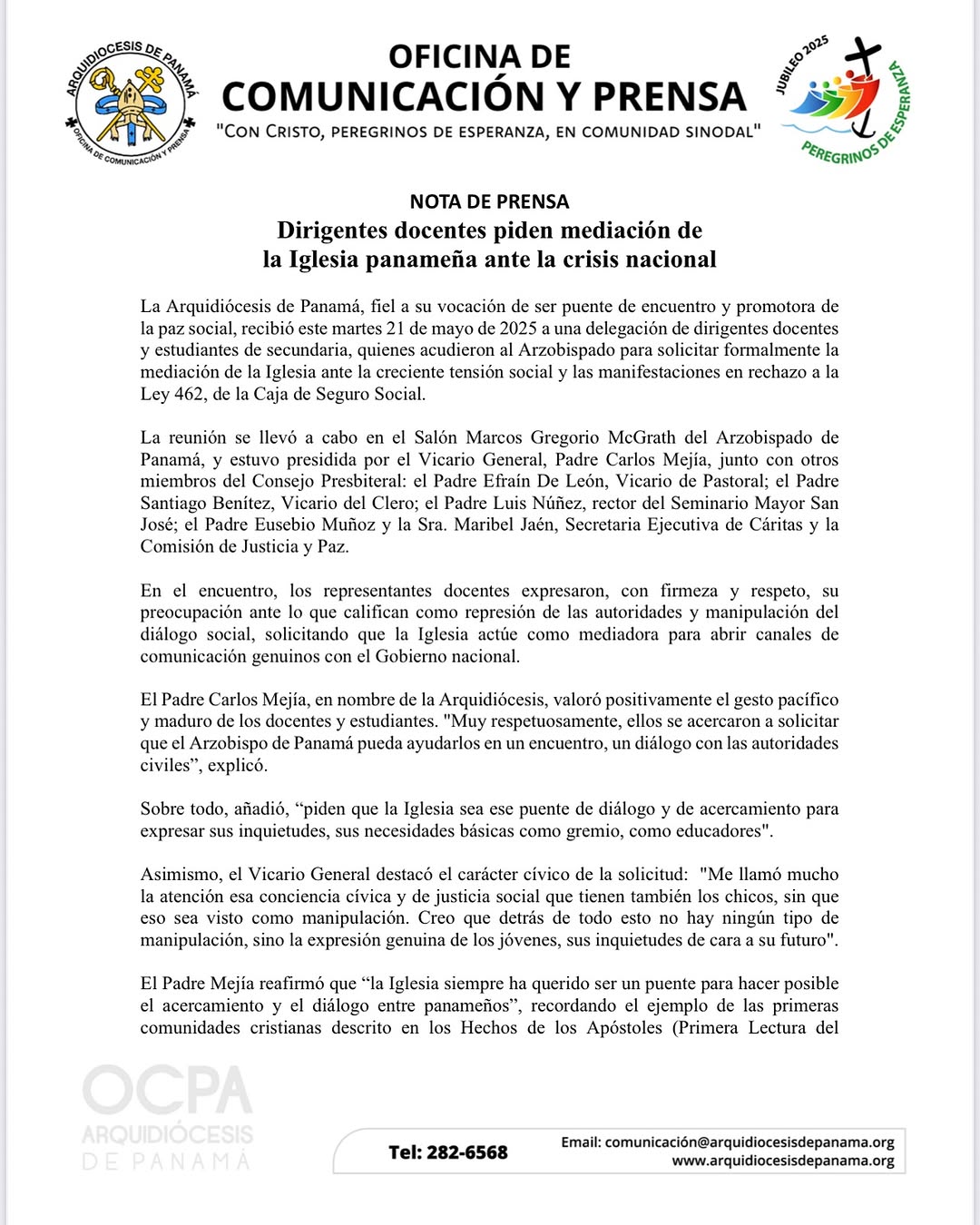 En un contexto de creciente tensión social por las protestas en rechazo a la Ley 462 relacionada con la Caja de Seguro Social, dirigentes docentes y estudiantes de secundaria solicitaron este martes la mediación de la Iglesia católica para facilitar el diálogo entre la ciudadanía y el Gobierno nacional. La solicitud fue presentada formalmente...