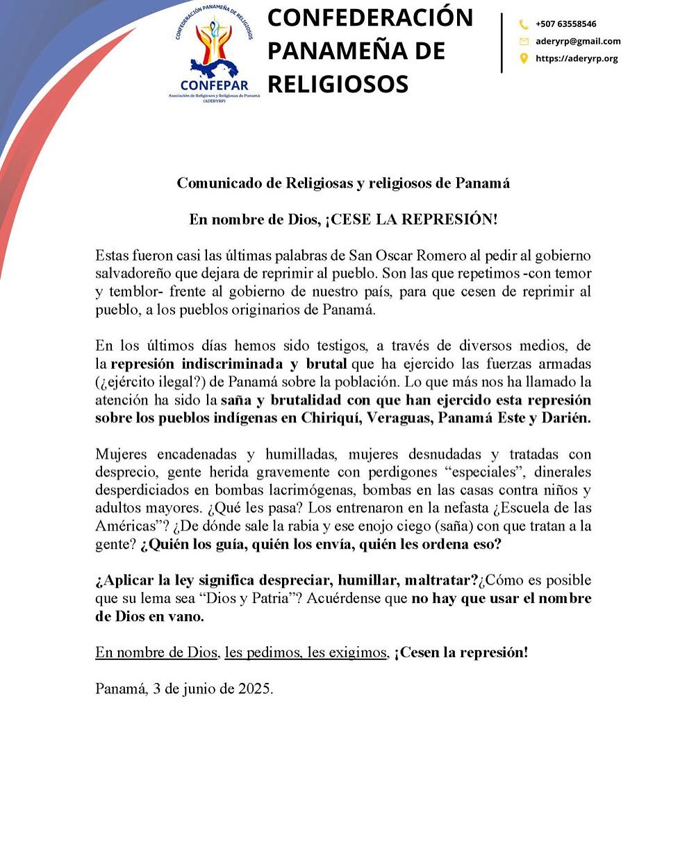 Ante la creciente tensión social en el país, provocada por las constantes manifestaciones contra la Ley 462 de la Caja de Seguro Social, los proyectos de embalses en Río Indio, el memorándum de entendimiento con Estados Unidos y la problemática minera, la Confederación Panameña de Religiosos (CONFEPAR) emitió un enérgico comunicado exigiendo el cese...