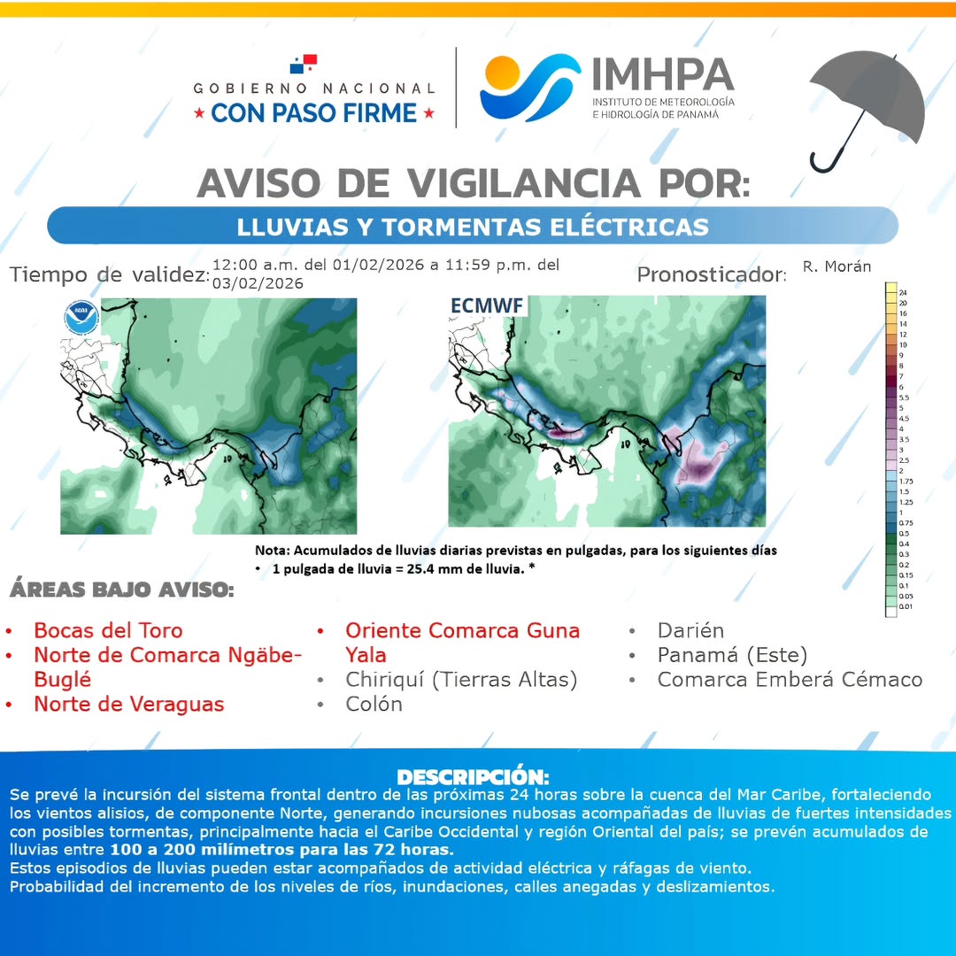 El Instituto de Meteorológia e Hidrología de Panamá emitió un aviso de vigilancia por lluvias y tormentas eléctricas, vigente desde las 12:00 a.m. del domingo 1 de febrero hasta las 11:59 p.m. del martes 3 de febrero de 2026. De acuerdo con el pronóstico del modelo ECMWF, se prevé la incursión de un sistema...
