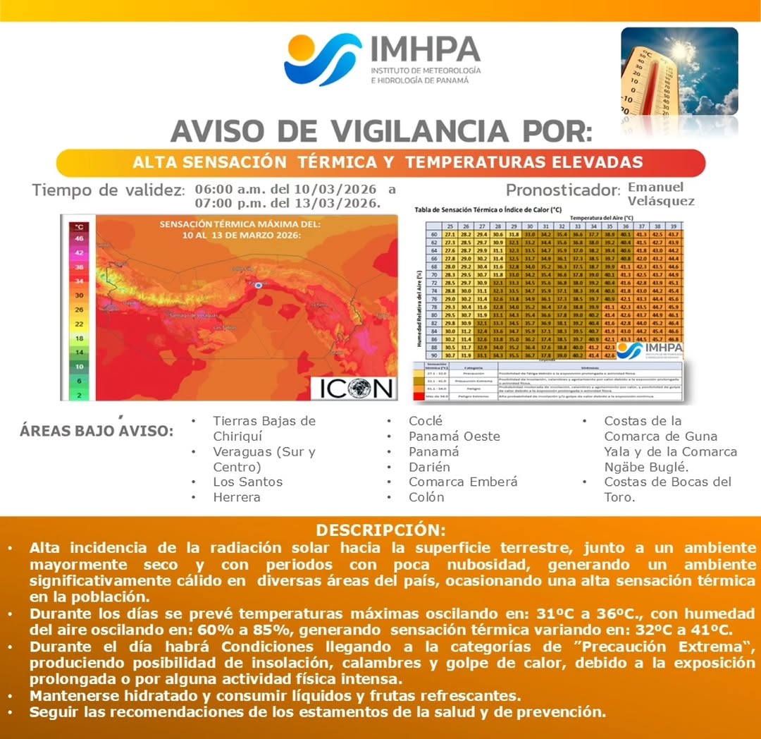 El Instituto de Meteorología e Hidrología de Panamá (IMHPA) emitió un aviso de vigilancia debido a la presencia de altas temperaturas y elevada sensación térmica en varias regiones del país, vigente desde las 6:00 a.m. del lunes 10 de marzo hasta las 7:00 p.m. del jueves 13 de marzo de 2026. Según el informe...