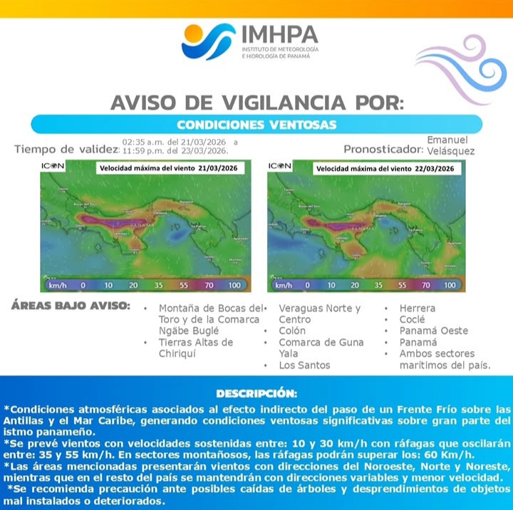 El Instituto de Meteorología e Hidrología de Panamá (IMHPA) emitió un aviso de vigilancia por condiciones ventosas, válido hasta las 11:59 p.m. del 23 de marzo de 2026, debido a efectos indirectos del paso de un frente frío sobre las Antillas y el mar Caribe. Según el informe, se prevén vientos sostenidos entre 10...